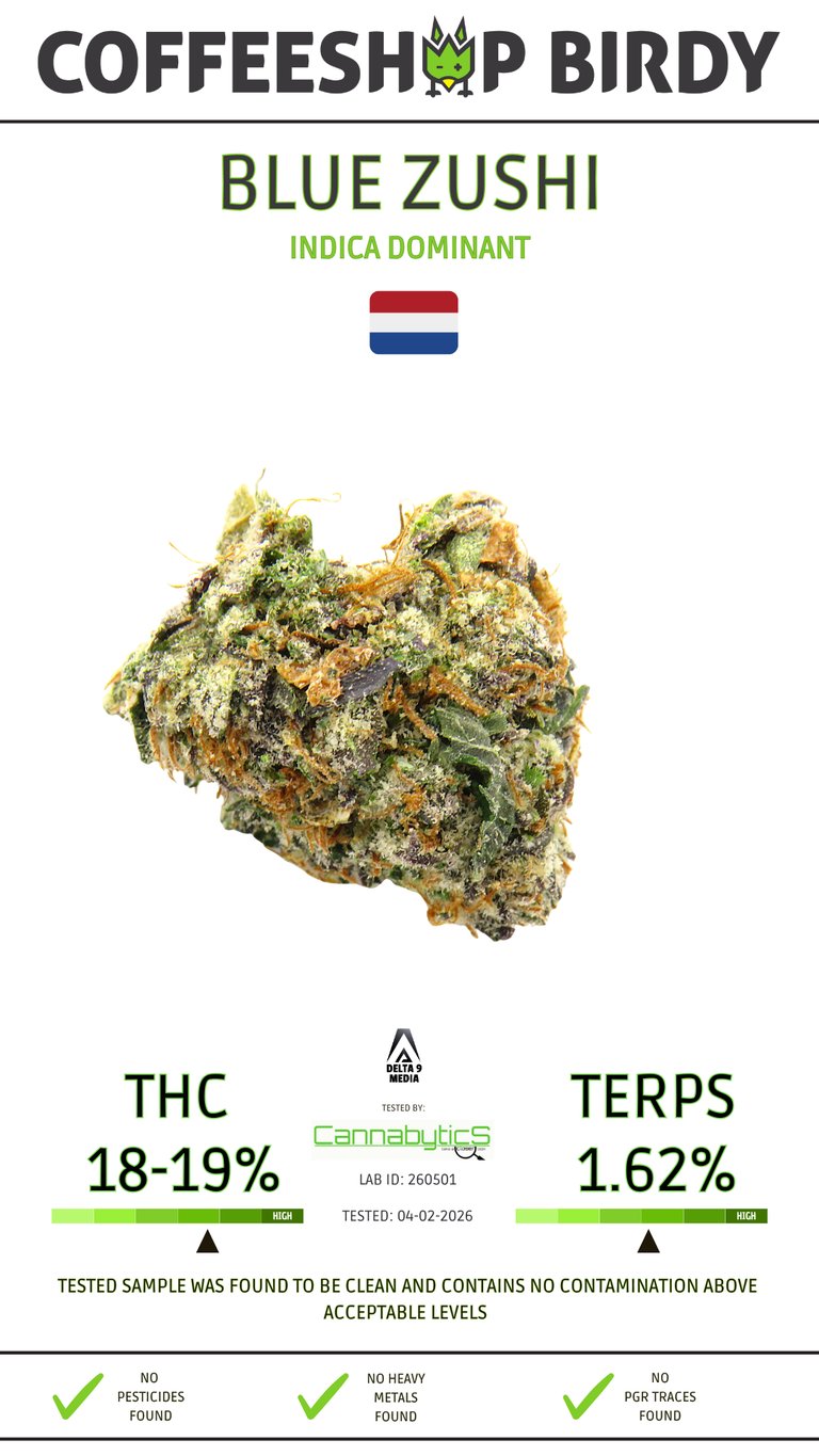 Blue Zushi provides a strong yet balanced high. The initial onset brings a euphoric cerebral lift, enhancing mood and creativity. Shortly after, a calming body relaxation develops, easing tension without causing heavy sedation. The overall effect is powerful but smooth, suitable for experienced users who want both mental stimulation and physical comfort.