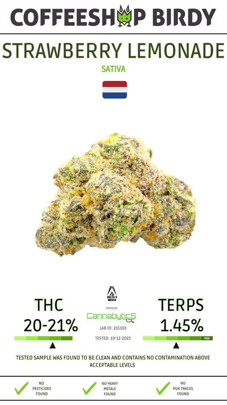 Strawberry Lemonade delivers an uplifting, clarity-focused high. Expect an initial wave of euphoria and mental stimulation, supporting creativity, conversation, and productivity. Physical effects remain light and non-sedating, maintaining full functionality throughout the session.