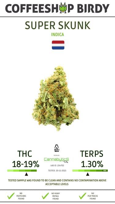 Super Skunk, an indica-dominant hybrid, builds on the legendary Skunk #1's legacy by introducing Afghani genetics into the mix. This strain is renowned for its deeply relaxing effects, skunky aroma, and ease of cultivation, making it a favorite among both users and growers for its consistent high quality and potent effects.