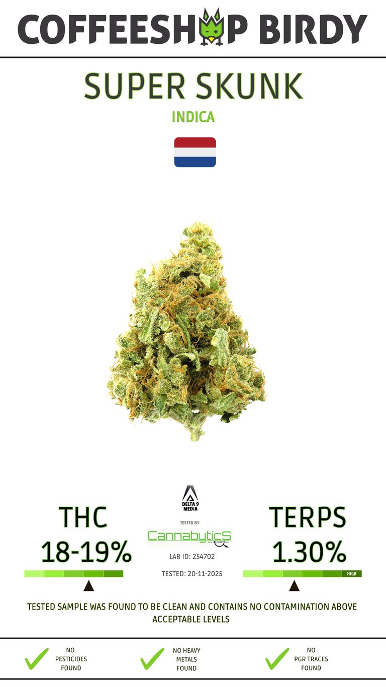 Super Skunk is celebrated for its powerful, relaxing effects that can soothe the body and calm the mind. Its indica dominance leads to a strong physical high, easing tension and stress, while the sativa elements may contribute to a mild euphoria and uplifted mood. This makes it ideal for evening use or days when deep relaxation is the goal.