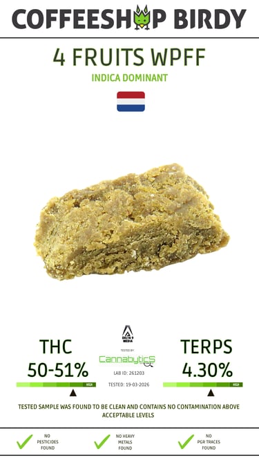 4 Fruits WPFF typically presents as a light golden to creamy extract, depending on the processing method (often live hash or rosin). The texture is soft, moist, and rich—ranging from buttery to slightly granular—indicating high terpene content and minimal degradation.