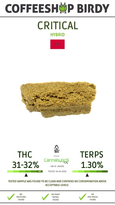 Critical is a strategic strain: efficient, consistent, and commercially optimized. Strong yields, stable effects, broad appeal. Not hype-driven—performance-driven. A proven asset in any serious cannabis portfolio.